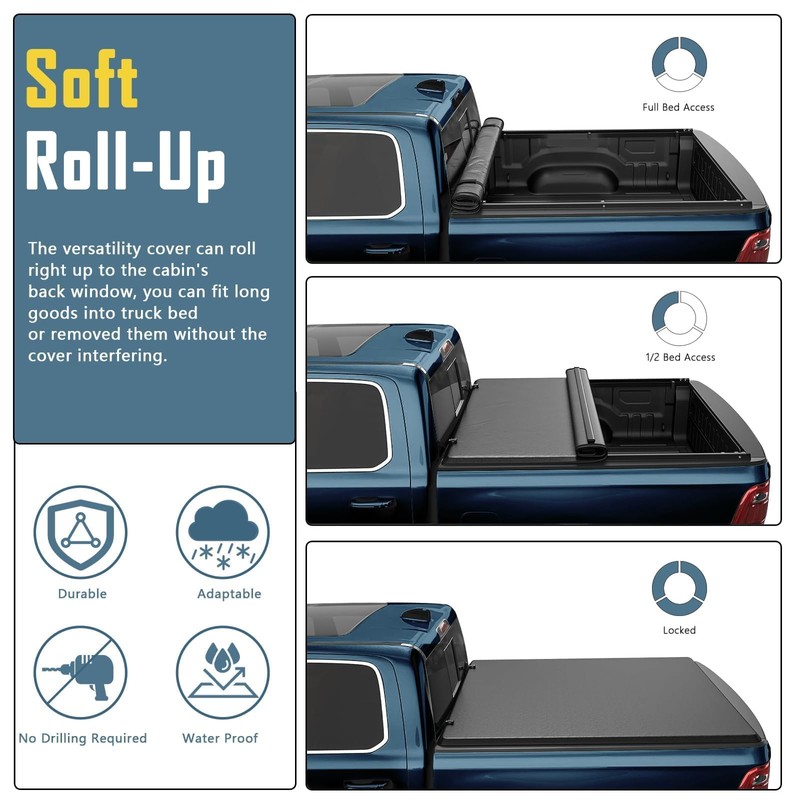 - Superior Material: The Tonneau Cover is crafted from a double-layer PVC material. It features high-quality vinyl that is waterproof, dust-resistant, and UV-resistant. Additionally, it comes equipped with side rails, a seal strip, and stainless steel clamps for secure mounting to the truck bed