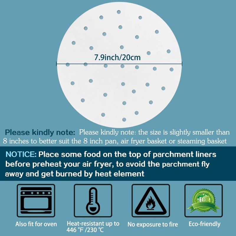 - LOTS OF PREPARED HOLES - Our perforated parchment liners is professional designed for air fryer/ steamer. Enough and proper holes help to speed up the steam circulation in air fryers or steamers.