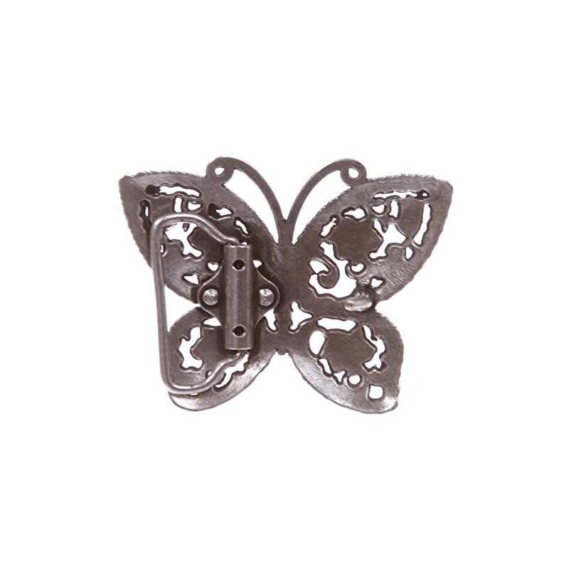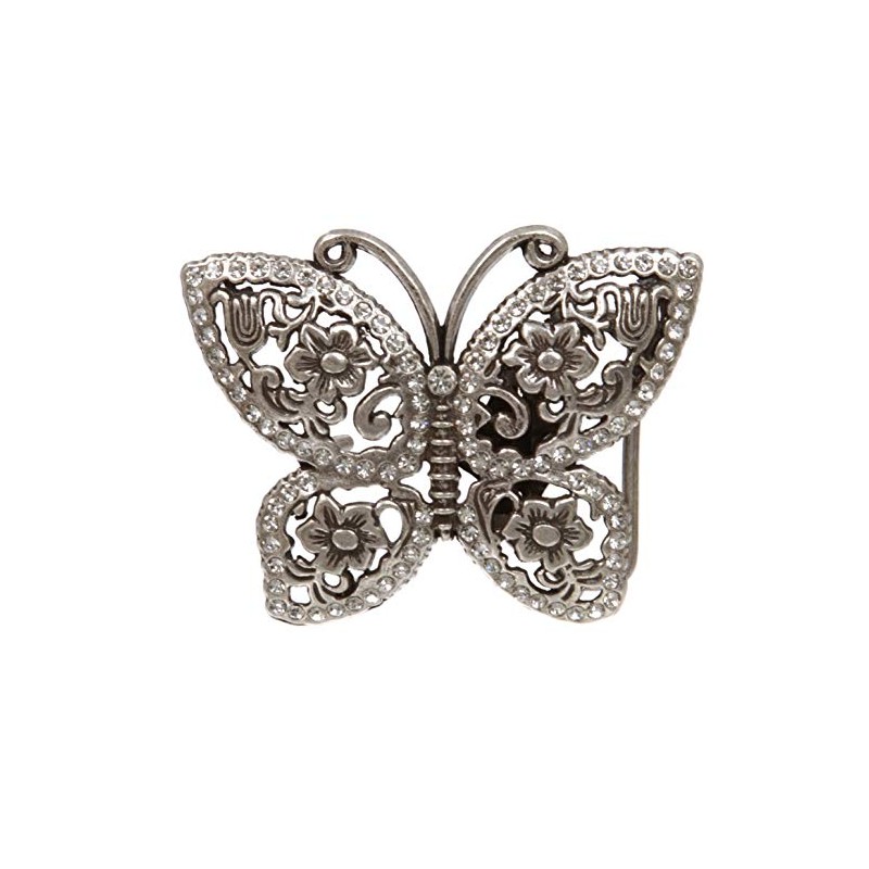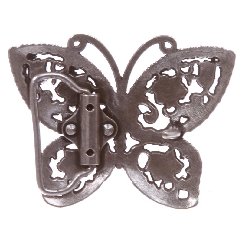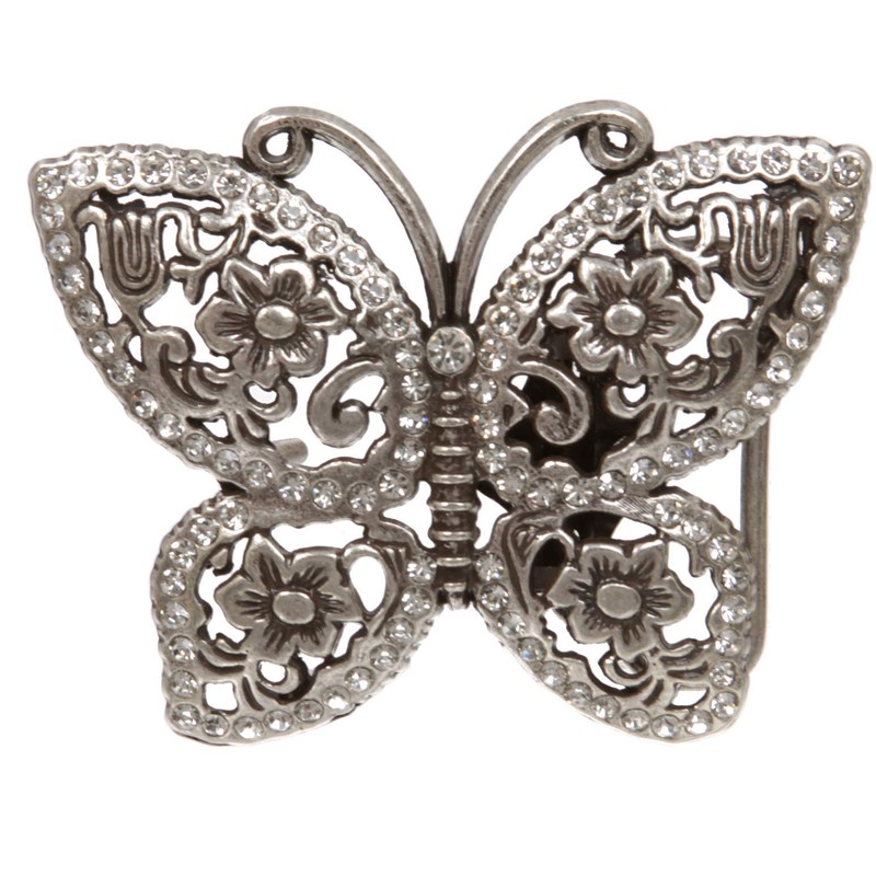 This beautiful antiqued silver butterfly belt buckle from Beltiscool features a rhinestone encrusted frames and floral filigree detail. Buckle measures 3.25" x 2.5" and has a standard 1.5" swivel.