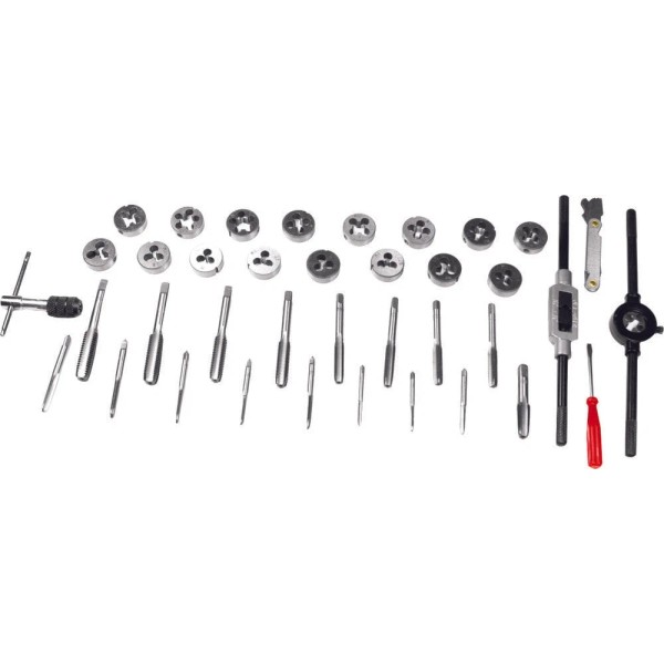 Includes: 17 taps and 17 dies (course/fine thread and NPT), T-handle tap wrench, tap/die holders, screw driver, pitch gauge and storage case.