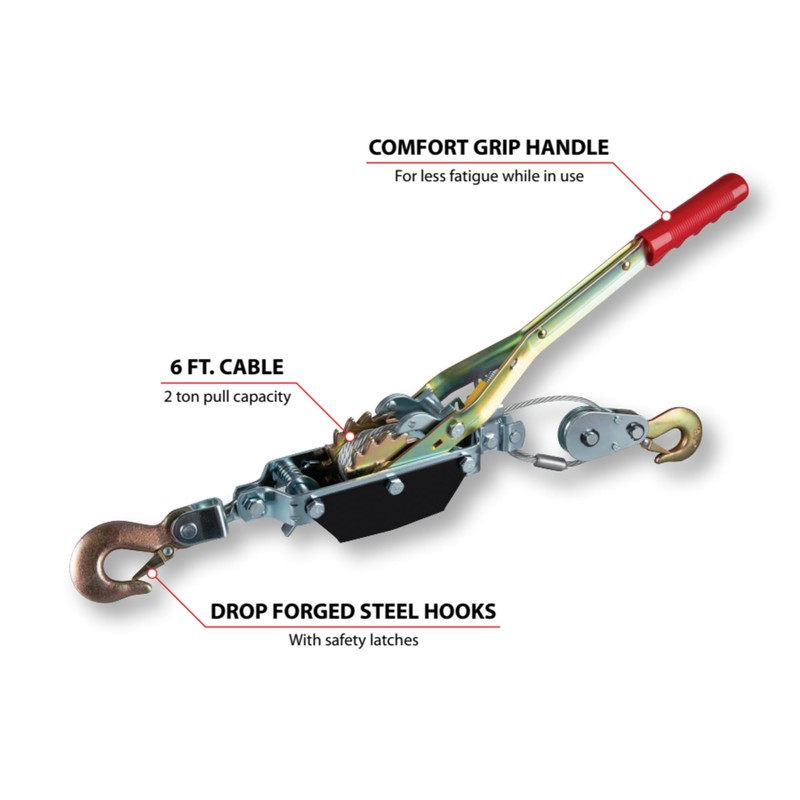 Drop forged steel safety hooks. Automatic notch at a time release for maximum safety. 2 ton pull capacity (rolling). 1 ton lift capacity. 6 feet aircraft cable.