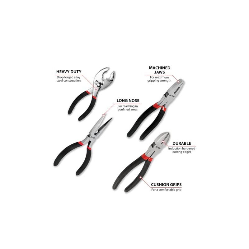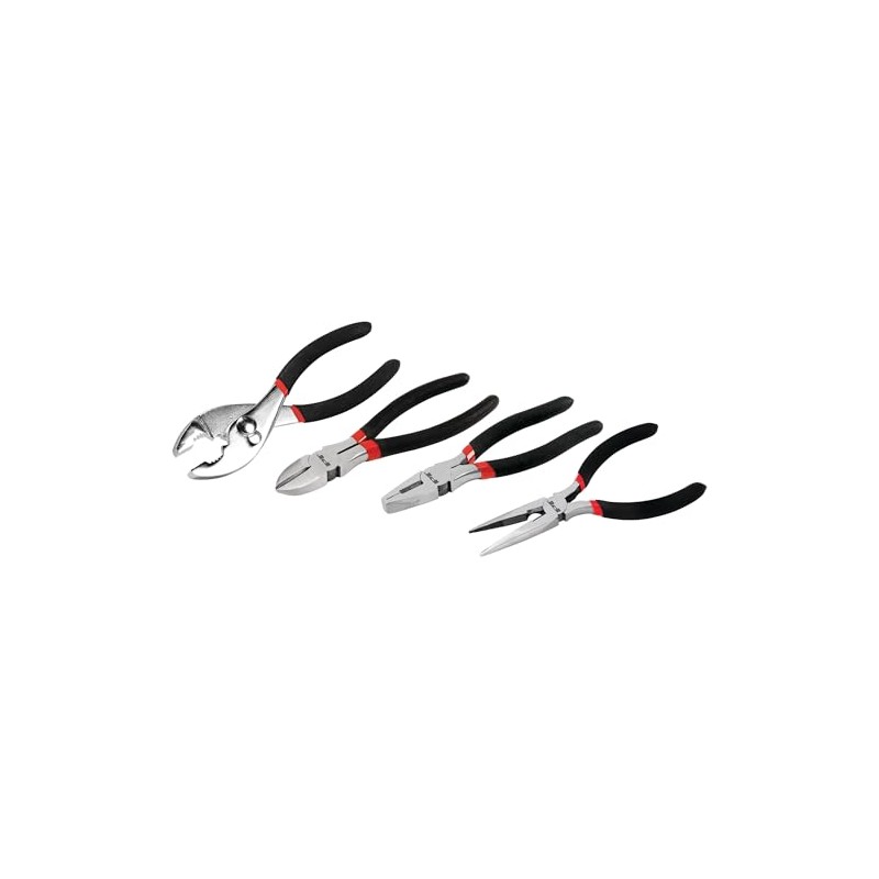 Performance Tool W1783 4 Pc. Pliers Set - Cutting Pliers, Linesman Pliers, Long Nose Pliers, Slip Joint Pliers, Drop-Forged Steel, Cushioned Handles, Black/Red