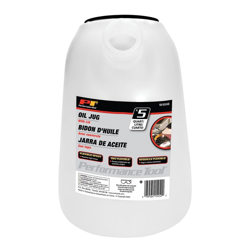 - LONG-LASTING: This Performance Tool W4046 5 Qt. Oil Jug is made from high-quality chemical-resistant plastic for longevity.