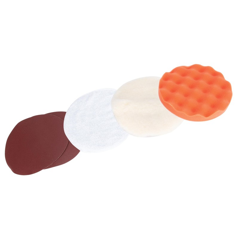 - Includes: Hook-and-loop backer pad, foam wax applicator, terry cloth, synthetic wool bonnet, two sanding disc pads and spanner wrench
