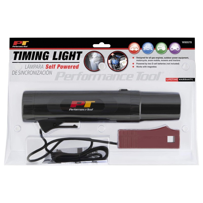 The Performance Tool W80578 Self-Powered Timing Light is designed for all gas engines, outdoor power equipment, motorcycle, snow mobile, mowers and tractors, works with magnetos. Detachable inductive pick up can be easily hooked up. Powered by 2 D cell batteries (not included).