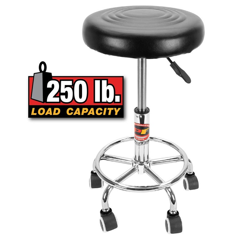 The Performance Tool W85027 is a modern style Pneumatic Rolling Bar Stool. It features an adjustable seat that ranges from a height of 19" to 24" quickly and easily, chrome plated frame and foot rest. 5 hooded dual-caster wheels for ensured stability and comfort. Stands at a max of 24" with a 13" diameter seat, the W85027 is ideal for auto shops, doctors' offices, tattoo parlors, message, reiki therapy and more. The max capacity is 250 Lbs.