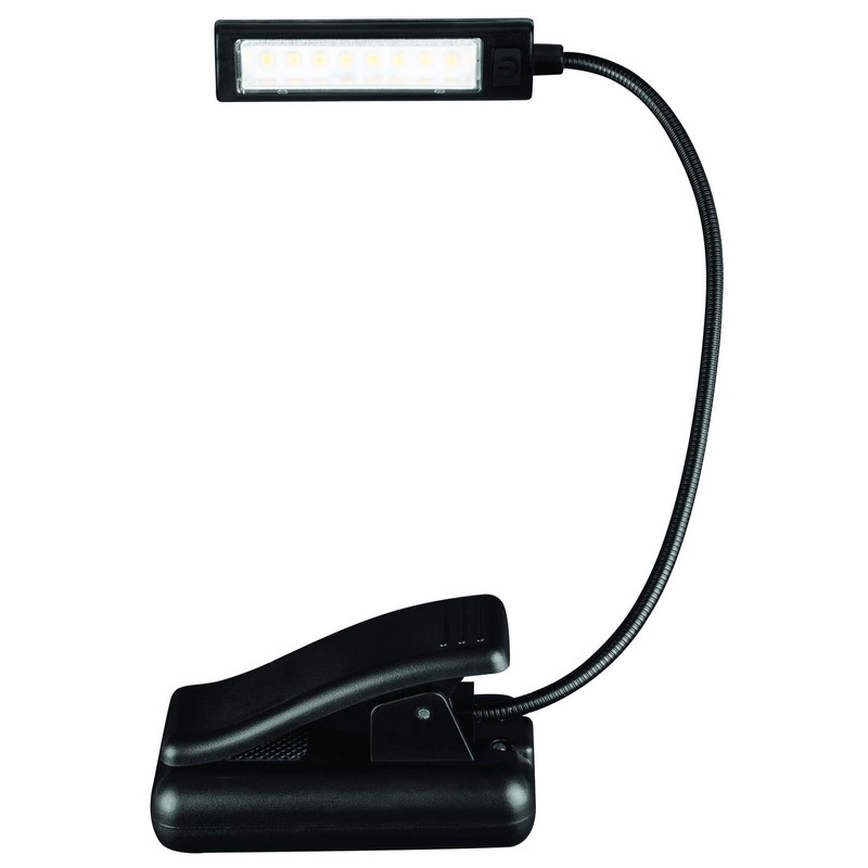 Low profile light bar provides 200+ lumens of warm white light. Flexible neck allows you to position light wherever you need it. Spring loaded clip features non-marring rubber padding and attaches to any object up to 1 inch (25mm) thick. Great for reading, attaching to a clipboard, tray table, tool box or work bench and more. Comes in counter display merchandiser. Specifications: 3 hour runtime, 3 hour charging time, 523450 1000mAh capacity lithium battery pack. Charging indicator is red while charging, green when full.