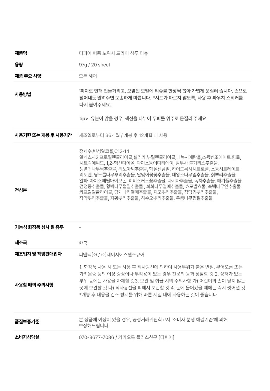 퍼퓸 노워시 드라이 샴푸 티슈 20매
