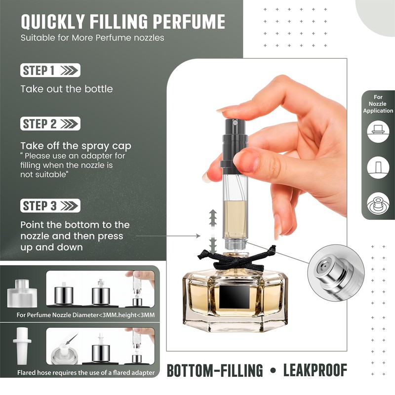- ✅【EASY TO USE】Our refillable spray bottle features advanced bottom-filling technology, compatible with all perfume nozzles. The package includes two custom adapters for hassle-free filling. No more funnels or droppers needed! Perfect size for easy refills.