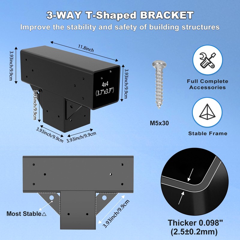 • 🔩ROBUST 3-WAY T BRACKETS--Pergola bracket 4x4 t-shaped kit made of 0.12" (3mm) thick carbon steel, this breakage-proof, deformation-proof wood pergola kits enhance pergola stability and safety. 3-way t gazebo bracket 4x4 kit suitable for standard 4"x 4" wooden beams on the market(actual 3.7" x 3.7"). Sturdy gazebo brackets 4x4 kit create a stable pergola for a family gathering.