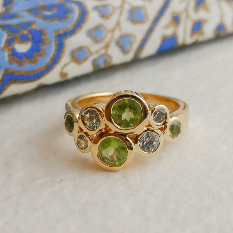 - Exquisites Design mit Natürlichen Edelsteinen – Dieser wunderschöne Damenring kombiniert Peridot (3mm & 5mm) und Blautopas (2,5mm & 3,5mm), eingefasst in vergoldetes 925er Sterlingsilber. Die harmonische Anordnung der runden Edelsteine verleiht dem Ring eine luxuriöse und moderne Ausstrahlung.