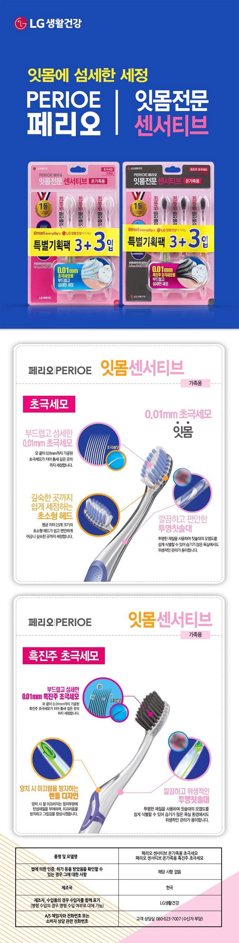 페리오 센서티브 흑진주 초극세모 칫솔 3+3입