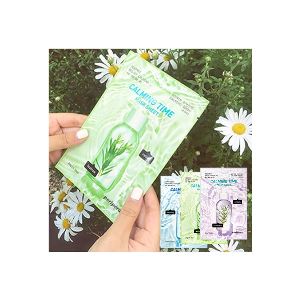 Indulge your skin with the Peripera Calming Time Mask Sheet, infused with cornflower extract to gently soothe and revitalize tired skin. This vegan-certified mask provides a calming and refreshing experience.