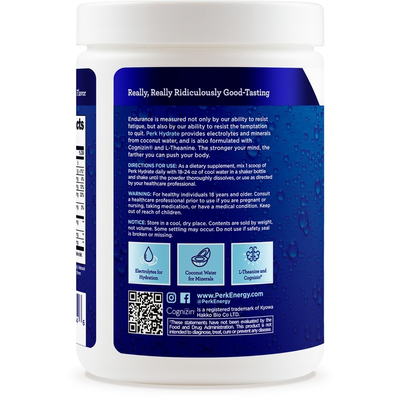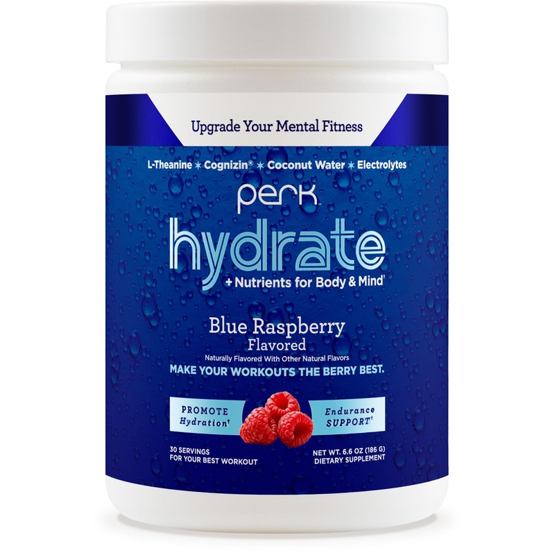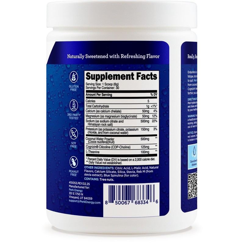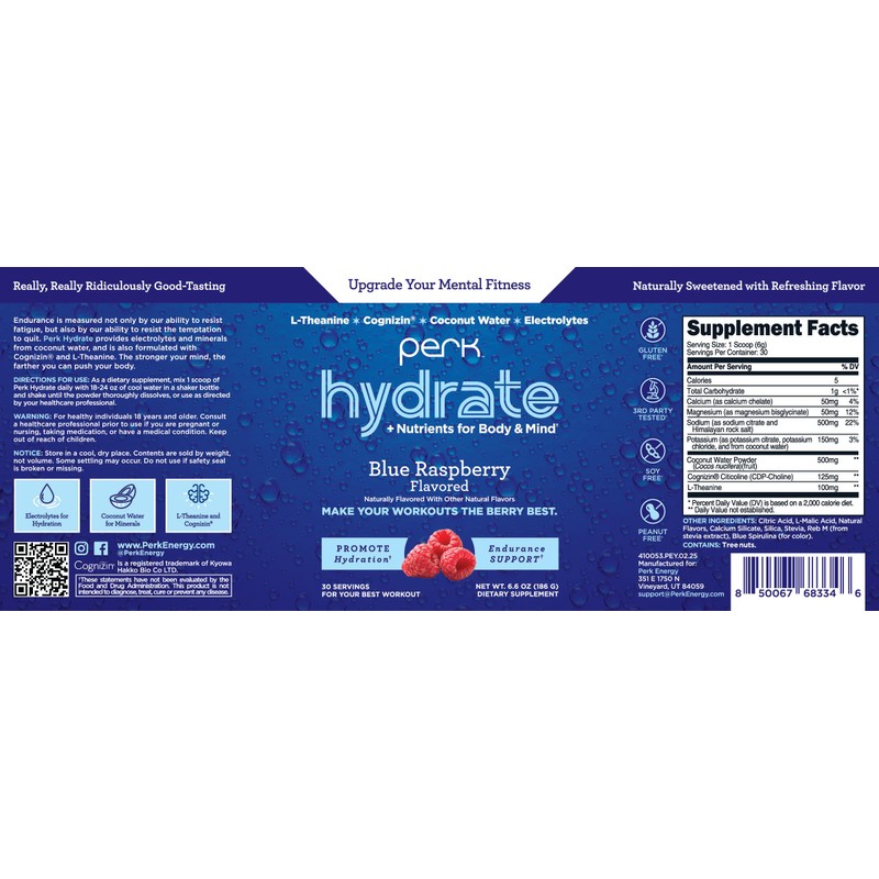 Perk Hydrate Blue Raspberry Flavored Electrolyte Drink Mix Powder (30 Servings) - Coconut Water, CDP-Choline, L-Theanine, Gluten-Free