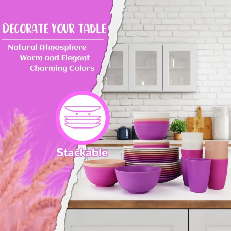 - PREMIUM WHEAT STRAW FIBER & PERFECT COMBINATION :Our wheat straw dinnerware set is made from PREMIUM wheat straw fiber and our perlapoc brand brings you a wheat straw dinnerware set which comes with 8 x 10 inch plate , 8 x 9 inch plate, 8 x 6 inch plate, 8 x 26 oz bowls and 8 x wheat straw drinking cups