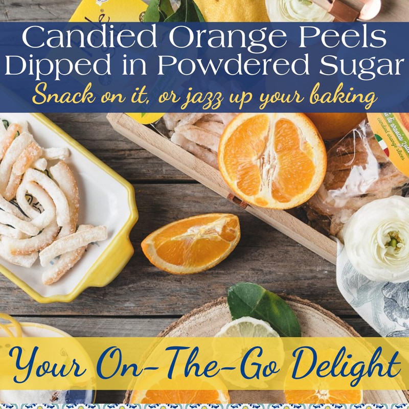 - MEDITERRANEAN ORANGES: Expertly crafted from the ripest Italian citrus, these candied orange peels are delicately dipped in powdered sugar, preserving their natural citrus essence