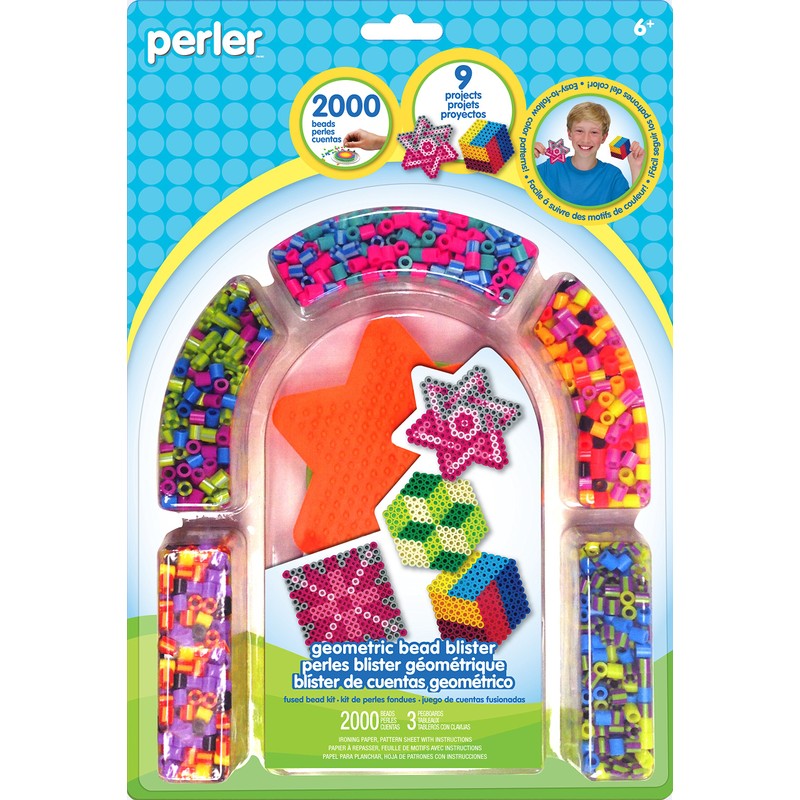 - This geometric pattern Perler bead activity kit includes enough fuse beads to create up to 9 cool crafts!