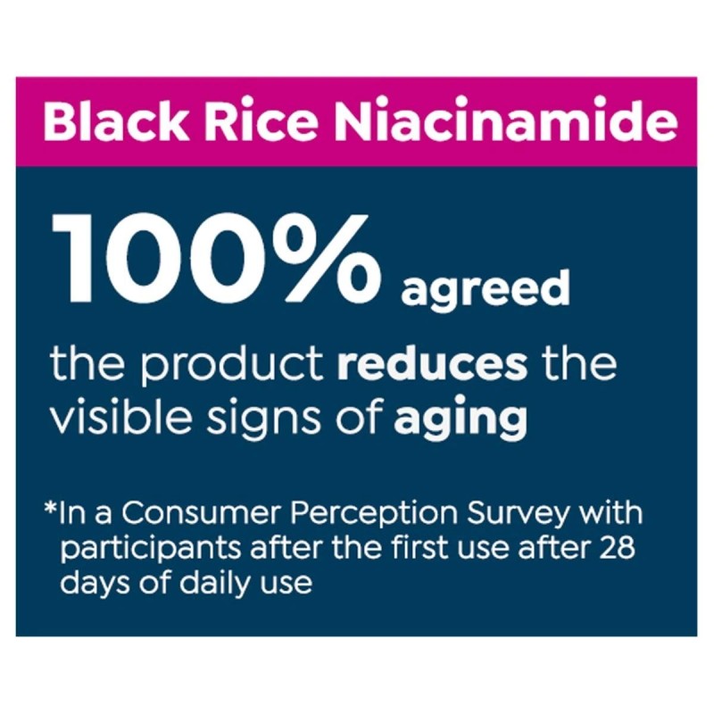 - In a Consumer Perception Survey with participants after the first use of the Black Rice Niacinamide after 28 days of daily use: