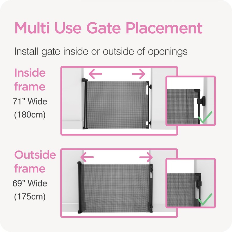 - PRODUCT DETAILS: Extending up to 71" wide and 33" tall this hardware mounted Retractable Baby Gate includes all components for easy installation.