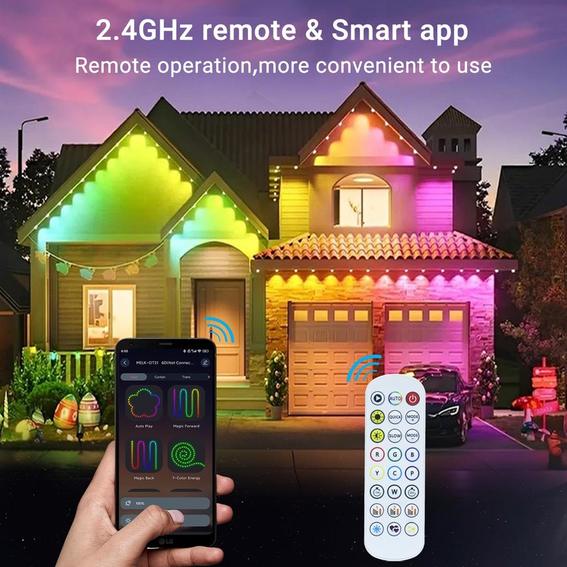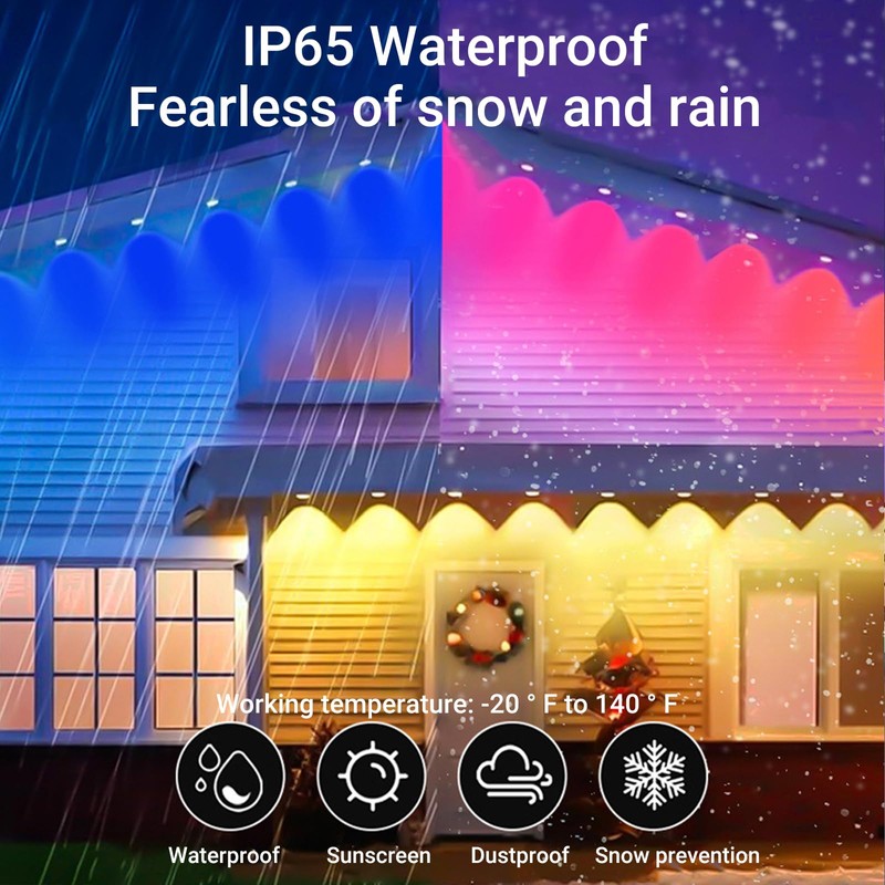 - 【Dynamic Festive RGB+IC Lighting】 :This RGB+ IC outdoor eave light with 33 scene modes,16 Million RGB colors, Music & Mic Mode, Multi functional mode selection, seven color jump, three color jump,seven color gradient, three color gradient, seven color strobe, timing function, etc