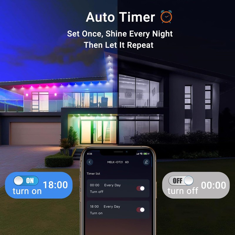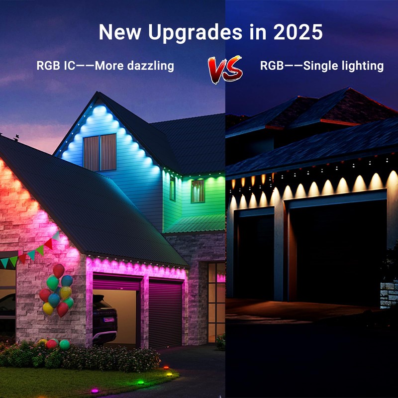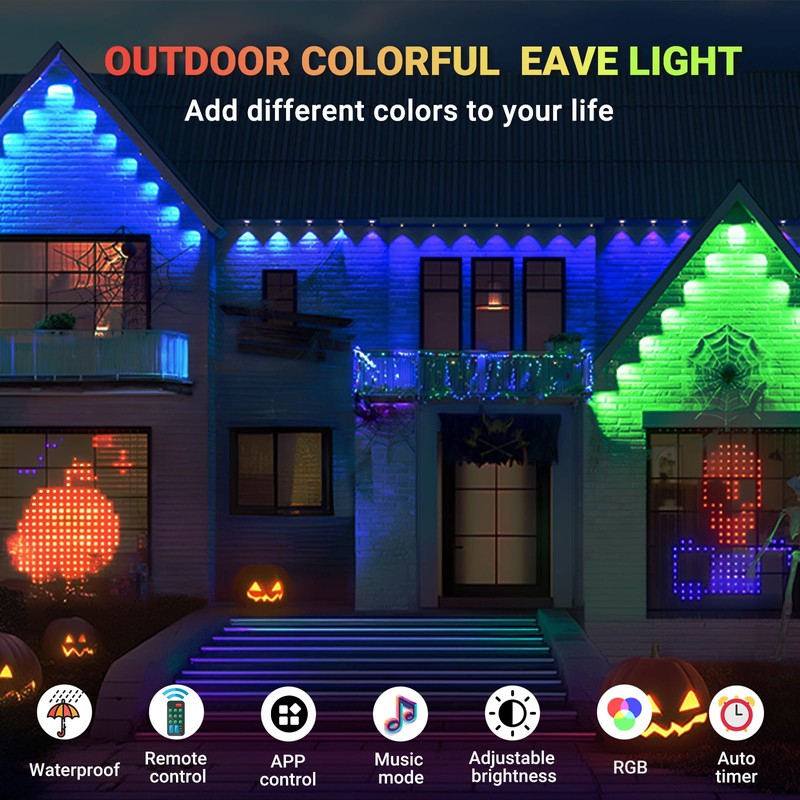- "【Widely Used】: This RGB+ IC outdoor eave light 16 Million RGB colors, Music & Mic Mode, Multi functional mode selection, seven color jump, three color jump, seven color gradient, three color gradient, seven color strobe, timing function, etc,festivals or important moments of decoration, such as Christmas, Halloween, Valentine's Day, Independence Day, birthdays, weddings, it is also effective in daily lighting"