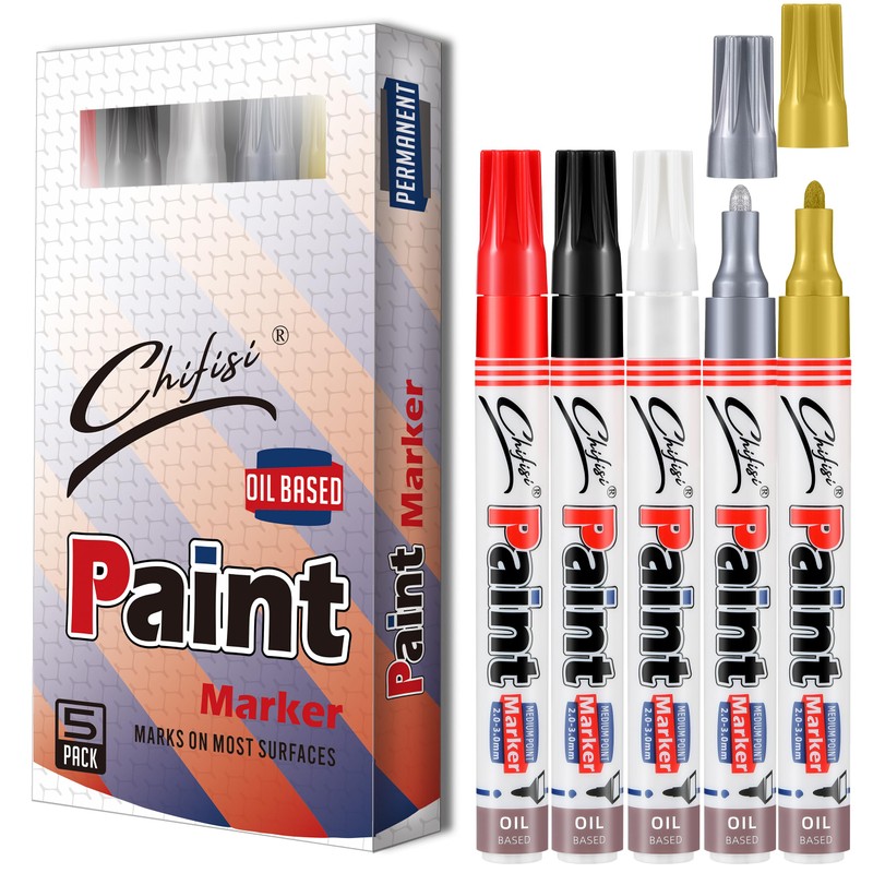 - 【INDIVIDUAL PACKAGE】Our pens are constructed with a valve.Each oil based paint marker pen is packed in a separate heat shrink film to avoid leakage during shipping or storage. Package contains 5 colors of pens, Including Black, White, Red, Gold and Silver.