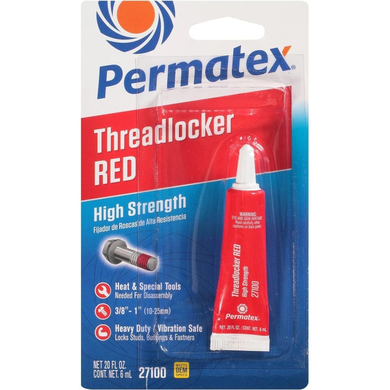 Permatex High-Strength Threadlocker Red is ideal for heavy-duty applications 3/8″ to 1″ (10mm to 25mm) Red threadlocker is well-suited for permanently locking studs and press fits. Threadlocker RED adds 3,000 PSI holding power on slip and press fit assemblies, and replaces set screws and snap rings. Permatex’s Threadlocker Red locks against vibration loosening. May require heat or special tools for removal.