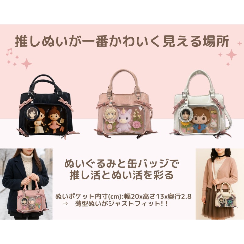 - Design: 2-way bag with transparent body and pink ribbon accents. Can be used as a handbag and shoulder bag