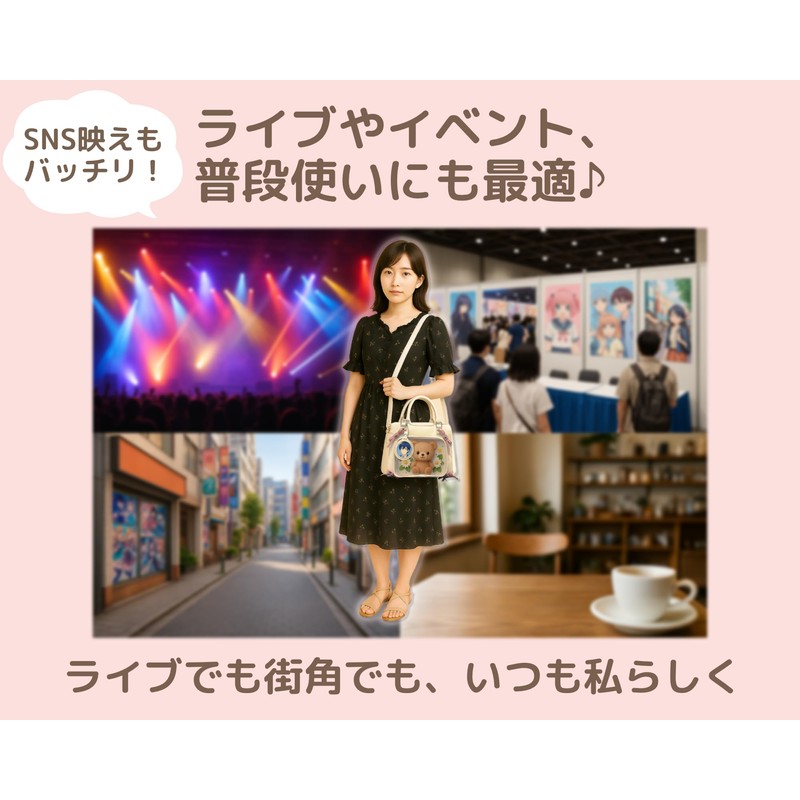 - Design: 2-way bag with transparent body and pink ribbon accents. Can be used as a handbag and shoulder bag