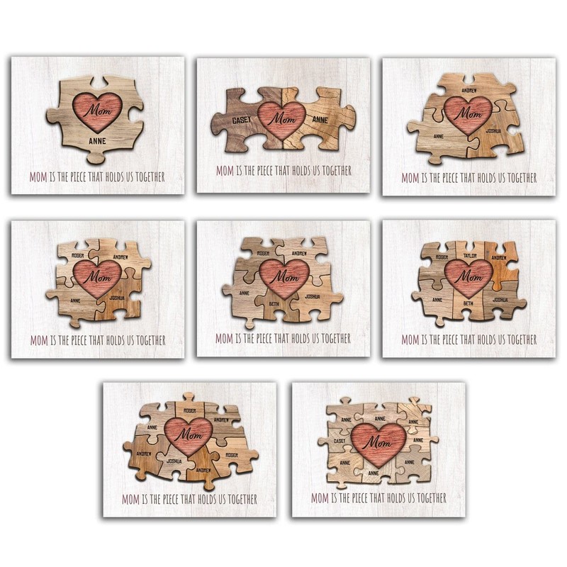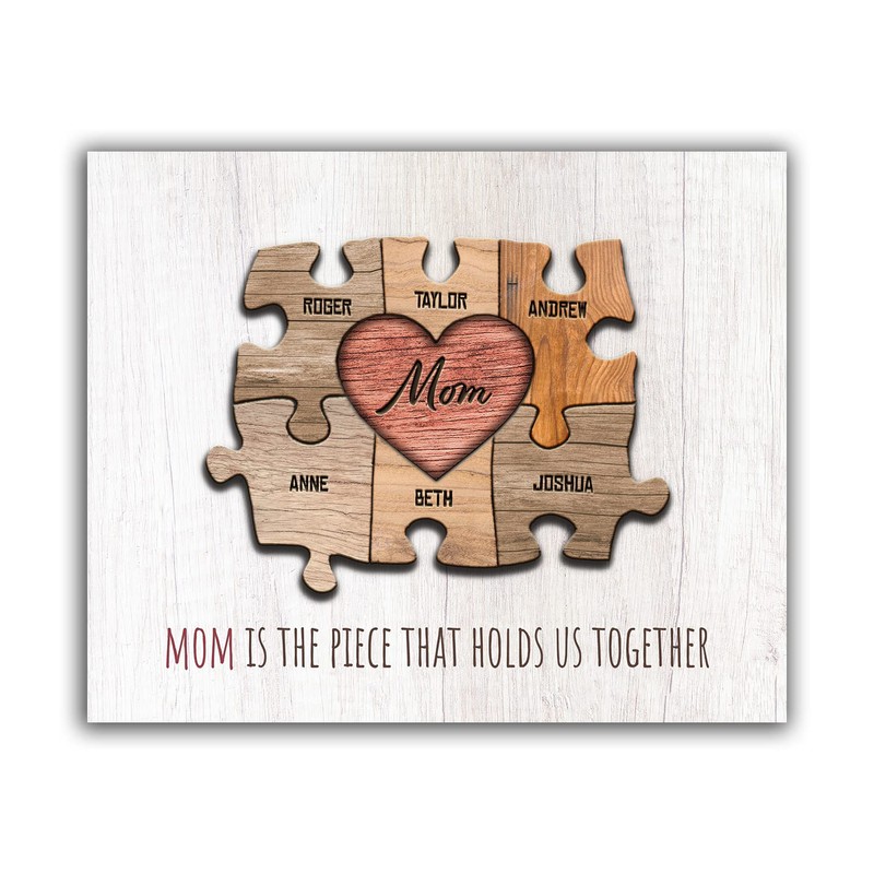 - PERSONALIZED: This unique print features “MOM” as the center puzzle piece with all of her children’s names as part of the art as whimsical wooden pieces. You can even include “DAD” and the pets. Below the custom printed art puzzle is the phrase “MOM is the piece that holds us together.”
