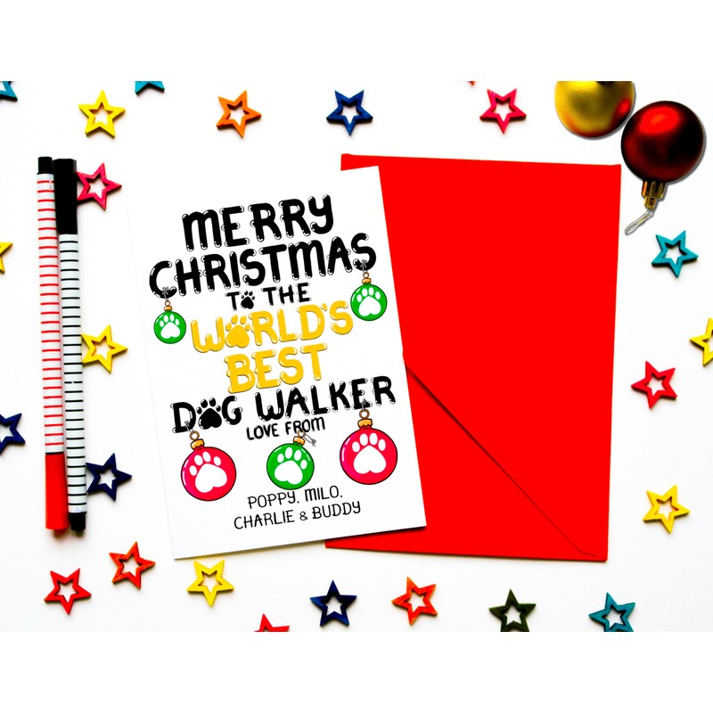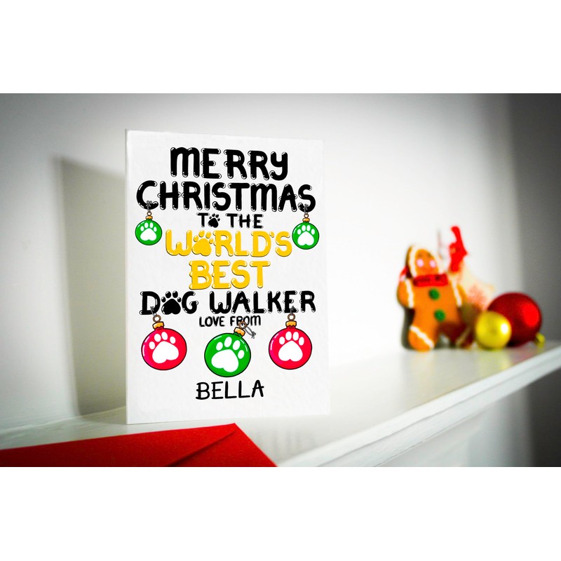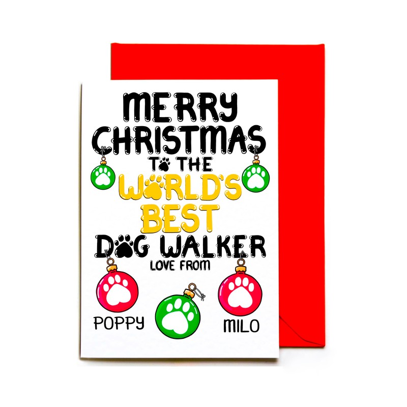 - Personalisable Festive Design: Add your Dog's names. This delightful Christmas greeting card features a whimsical design with paw prints, baubles, and the text 'Merry Christmas to the World's Best Dog Walker' in a fun, playful font.