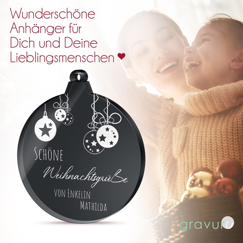 - ✔️ Material: acrylic pendant individually engraved (approx. 5 mm thickness). With ribbon in different colours. The Christmas pendants are specially cut and labelled with high-quality laser engraving.