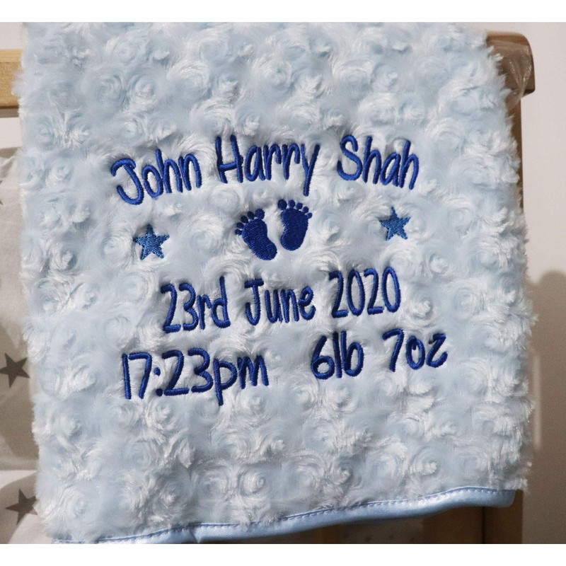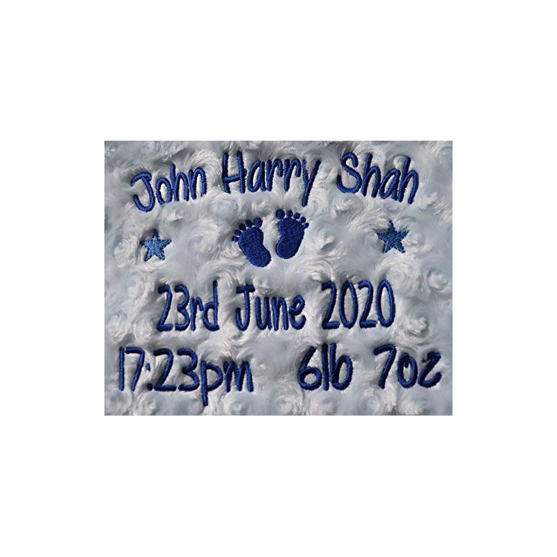 Personalised Baby Blanket Luxury Rosebud Style Blue Round Font Name Date Weight Time Print