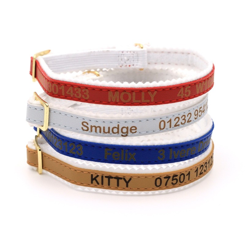 You can simply design a custom collar for your cat. Personalized with the name or text of your choice.