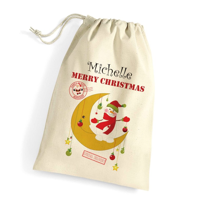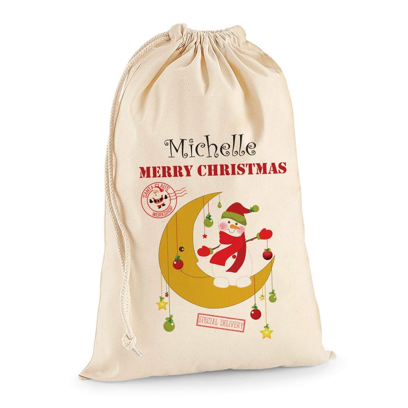 Personalised Custom Made Santa Christmas Natural Cotton Sack Bag Extra Large (75 x 49 cm 38 litres) with Drawstring for Xmas Holiday Presents - Santa&Moon