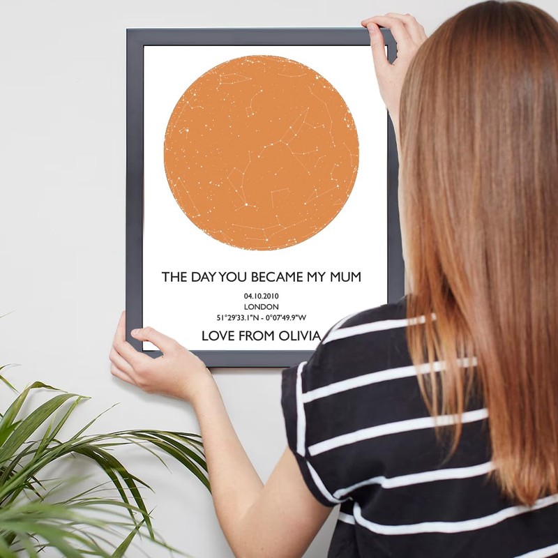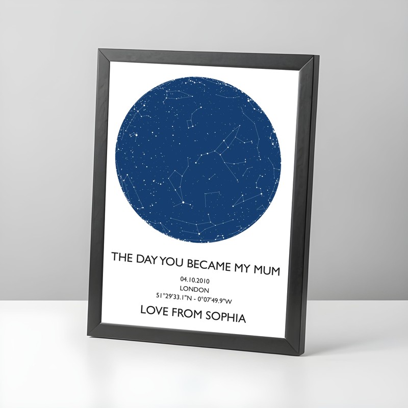 • Personalised Star Map Print for Mum: Capture the exact night sky on the day she became a mother with a custom star map, creating a heartfelt Mother’s Day keepsake or a sentimental mum-to-be gift.