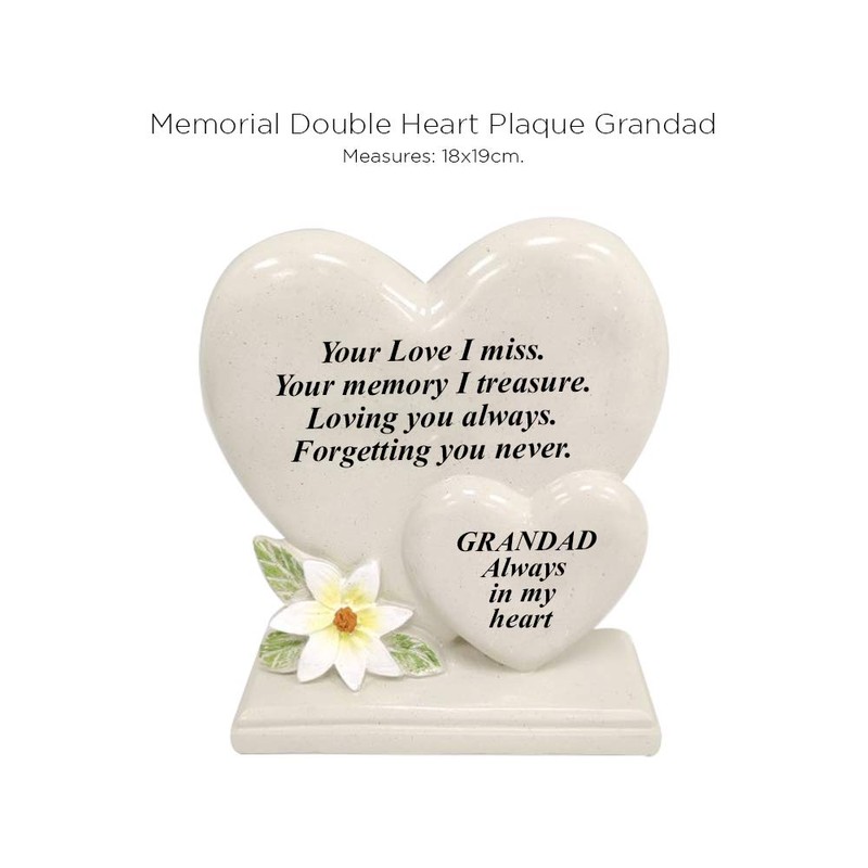 - [Graveside Memorial Plaque] A double heart memorial/remembrance plaque ornament and grave decoration sign gift, made especially for your special deceased ones be it your mum, grandad, grandma, dad, husband, son, daughter, someone special, someone died too early, or gran. It can be placed at the graveside as well as in your homes. Its dimensions are 18 x 19 centimeters