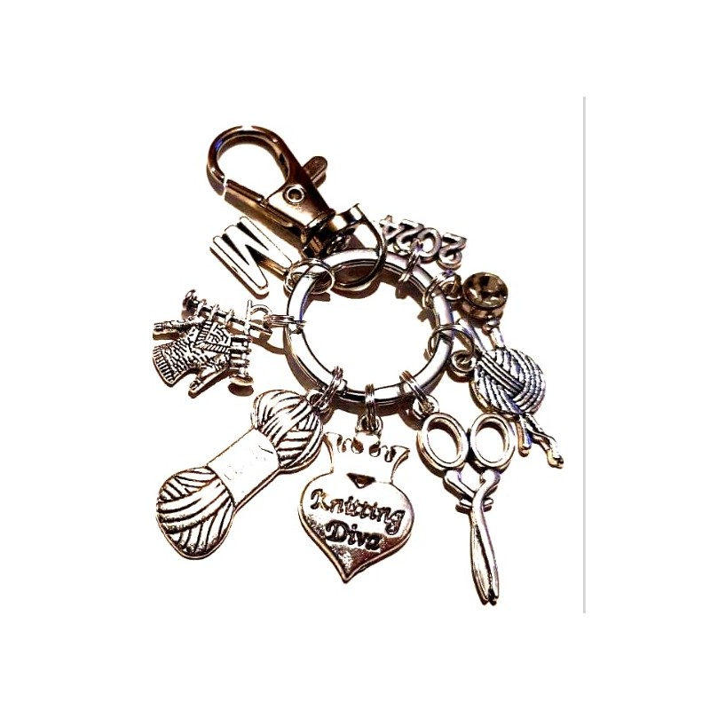 - Unique Charm: A stylish keychain featuring an assortment of charms including scissors, a knitting needle, a heart, and the word 'Knitting Diva'.