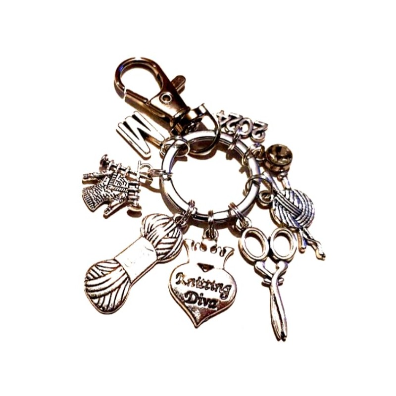 Personalised 'Knitting Diva' Keychain with Initials, Knitter Key Ring with Scissors, Yarn Ball, and Other Charms