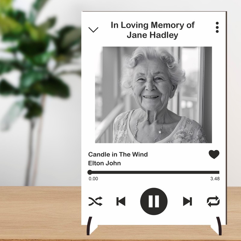 Losing someone you love is never easy, but remembering them in a personal and meaningful way can bring comfort and peace. This beautiful music-themed plaque is designed as a tribute to a cherished life. Thoughtfully styled to resemble a modern music player, it features a photograph of your loved one, their name, and a chosen song that holds special meaning—be it their favourite track or a song played at their funeral.