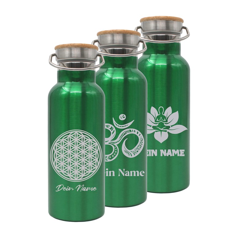 Personalised Stainless Steel Water Bottle with Name and Motif 500 ml / 0.5 L with Bamboo Lid Esoteric (Green)