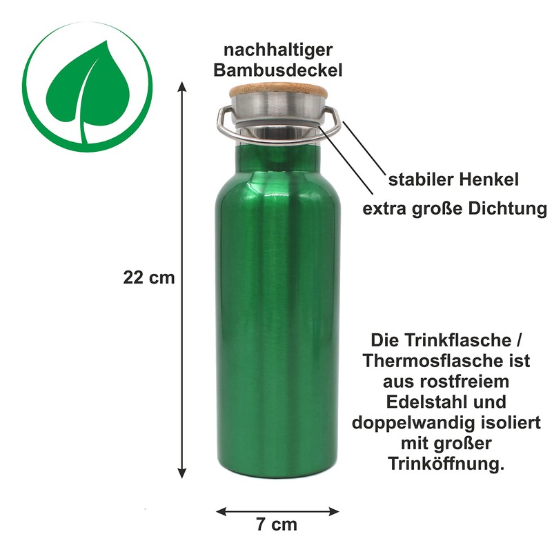 - Drinking bottle: the stainless steel thermos bottle holds 500 ml and thanks to the taste-neutral stainless steel, your drink always tastes as fresh and clear as it should taste. Free from chemical processing or unpleasant aftertaste. The water bottle can be individually designed directly on Amazon. Simply click on the "Customise now" button, select your desired motif and enter a name or text.