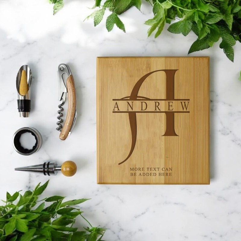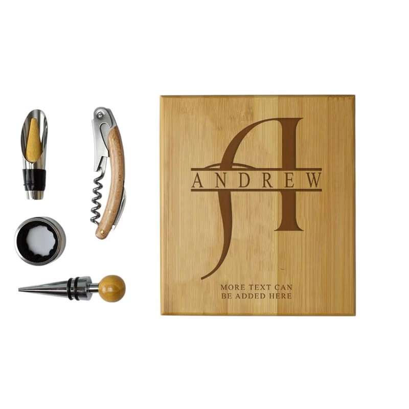 Personalised Wine Accessories Gift Set with Corkscrew, Stopper, Pourer, Drip Ring in Wooden Box, 16 x 15 x 4 cm, Name and Alphabet