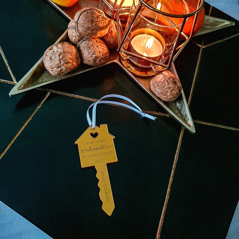 Das erste Weihnachten in den eigenen vier Wänden ist etwas ganz Besonderes. Mit diesem personalisierten Christbaumanhänger in Schlüssel-Form werden Sie Jahr für Jahr an dieses besondere Fest erinnert.