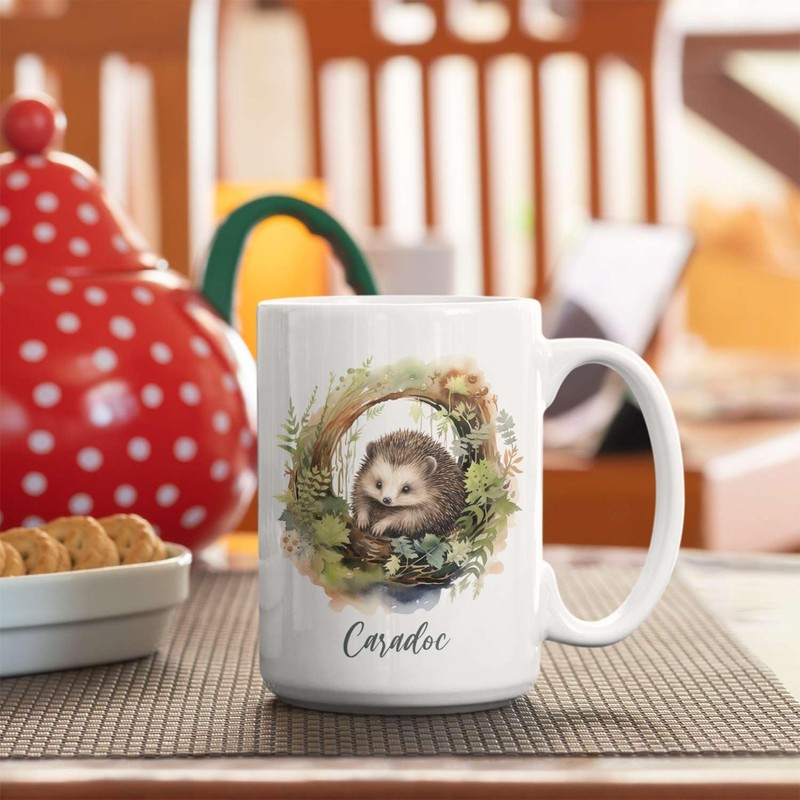 Personalized Adorable Hedgehog Curled Up In Forest Wreath Mug, Customized Nam...