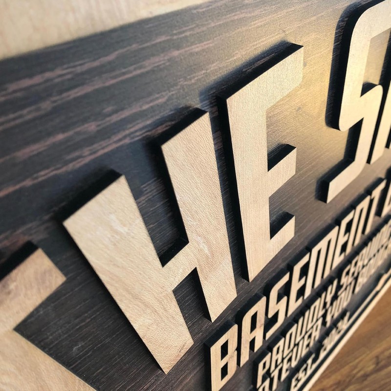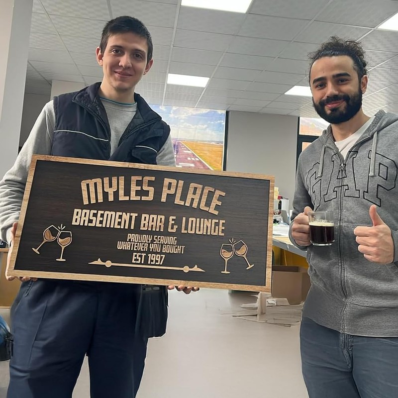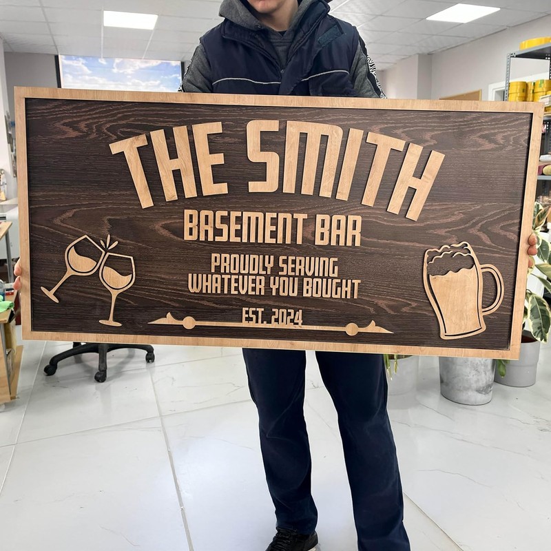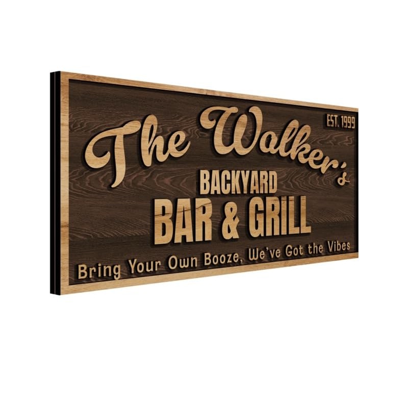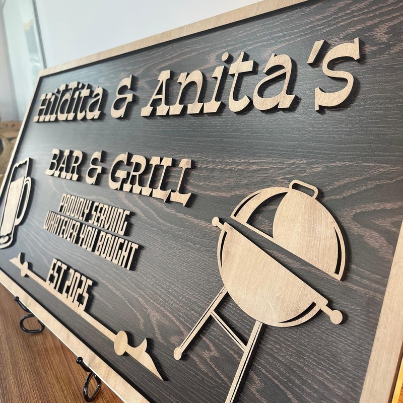 - Rustic Wooden Charm – Crafted from layered wood in a timeless dark finish with raised lettering and fun icons like a beer mug and BBQ grill.