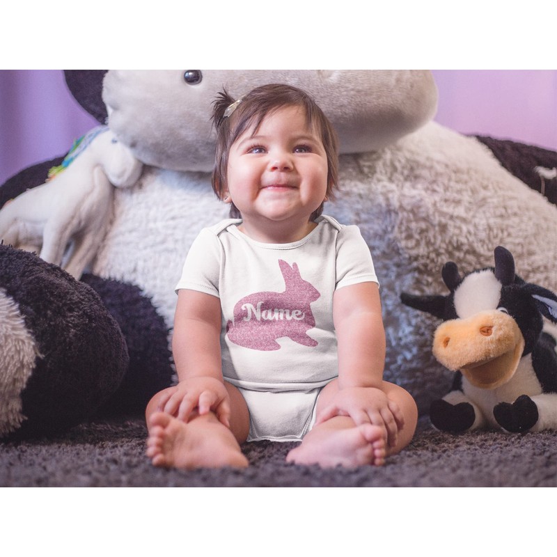 - Details: One (1) single Personalized Bunny Name Iron On Decal. Choose from Glitter or Non-Glitter Colors! The name is cutout and will be see through clear in the bunny.