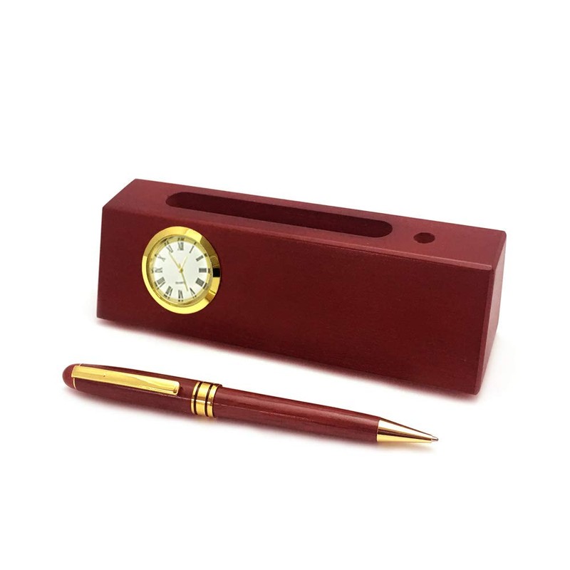 - High quality rosewood business holder wedge with clock and roller ball point pen. Please note: Due to natural wood, the color of the pen might be lightly different with the wedge.