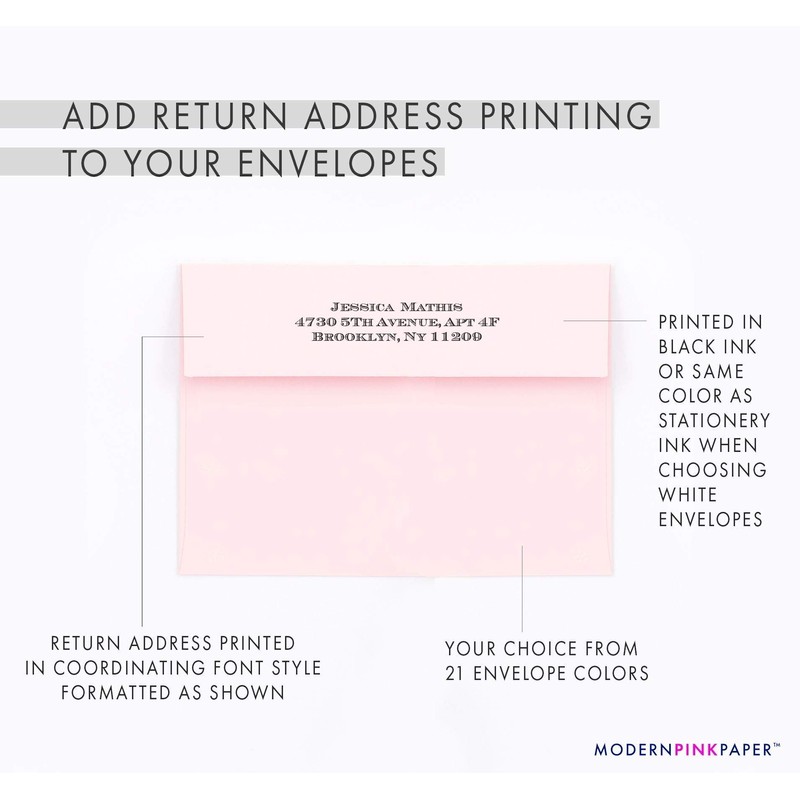- Return Address: Return address will be printed in BLACK ink when choosing a colored envelope. If you choose a white envelope, return address ink will match the stationery ink choice.