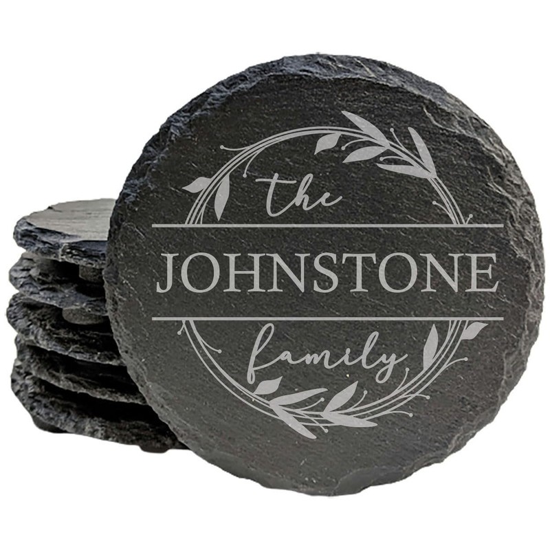 Personalized Monogram Coasters, Natural Slate Stone Coaster Set, Birthday, Wedding Or Anniversary Gift, Customized Rustic Coasters, Drink Coasters - Round Slate - set of 8